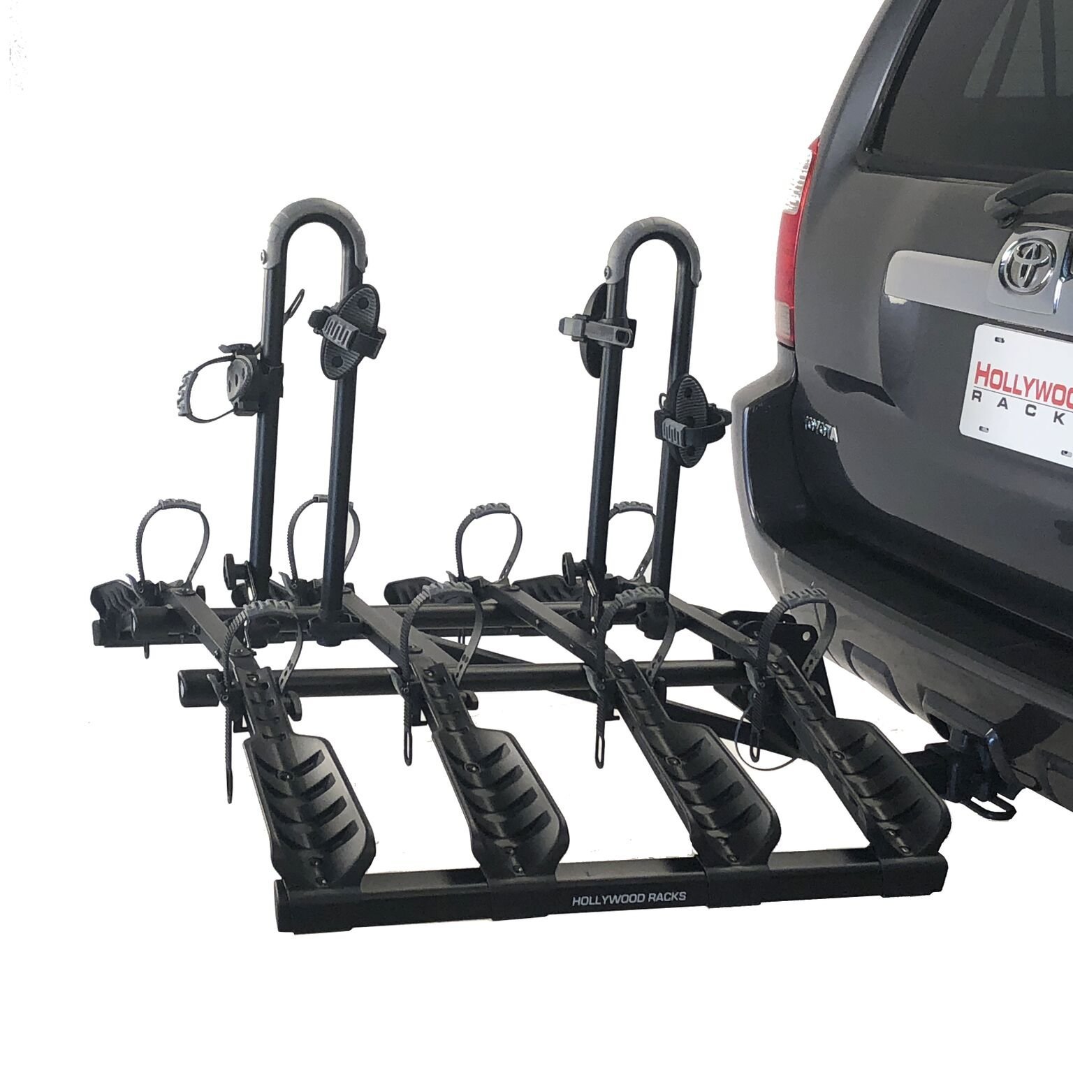 The new Destination Rack is our lightest 4 bike platform hitch rack. Weighing only 42 pounds, this rack securely carries 4 bikes in individual wheel trays making loading and unloading quick and easy. Padded frame holders with ratchet straps slide vertically along the center post and rotate 360 degrees to attach to different frame shapes and sizes. The wheel trays use ratchet straps to secure the bikes wheels. Includes a locking threaded hitch The new Destination Rack is our lightest 4 bike platform hitch rack. Weighing only 42 pounds, this rack securely carries 4 bikes in individual wheel trays making loading and unloading quick and easy. Padded frame holders with ratchet straps slide vertically along the center post and rotate 360 degrees to attach to different frame shapes and sizes. The wheel trays use ratchet straps to secure the bikes wheels. Includes a locking threaded hitch pin.pin.