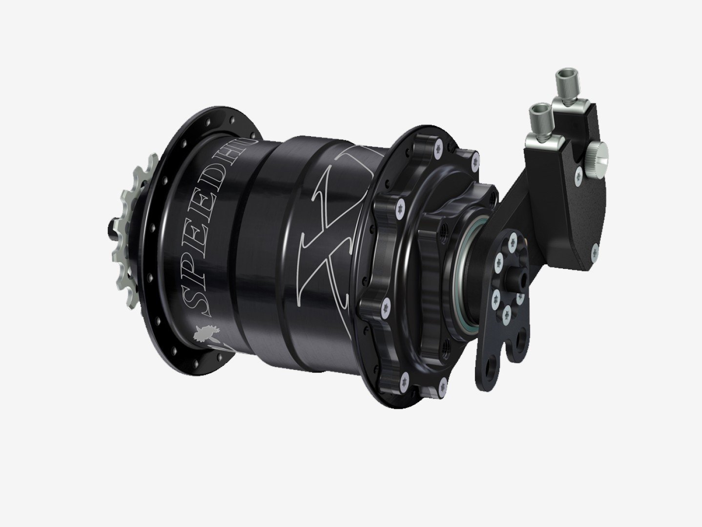 Rohloff SPEEDHUB 500/14 CC DB XL – 170mm O.L.D. – black only! Kit includes: Hub with quick release axle, Hub-cap with mount for special brake rotor, Twist shifter, Shifter cables, mounting hardware, External gear mech, Standard axleplate and Chain tensioner. Brake rotor not included.