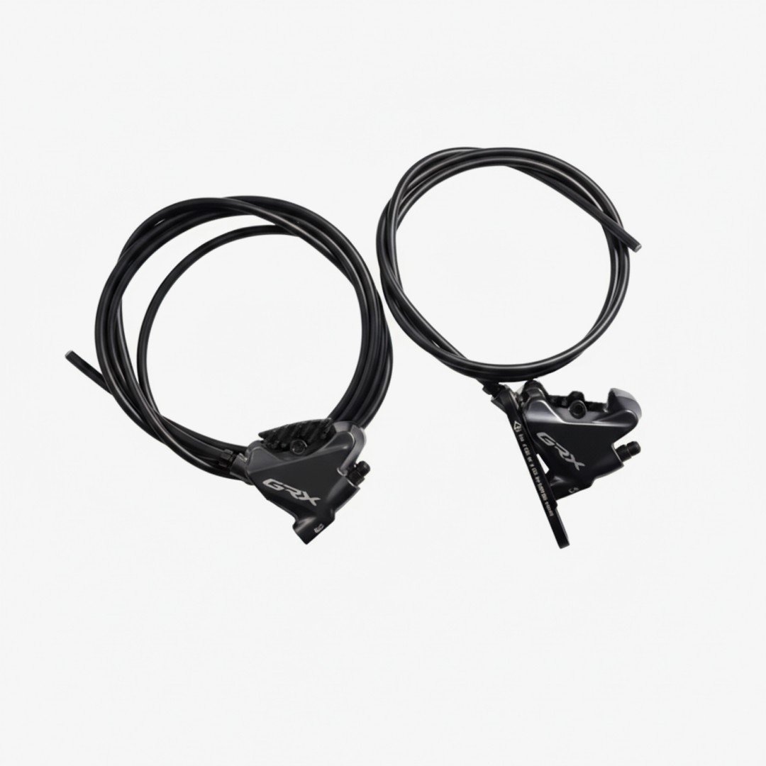 The hydraulic 2-piston brake calipers Shimano GRX BR-RX820 for front and rear with Flat-Mount and L05A-RF Resin disc pads with fin. Brake hose installed.